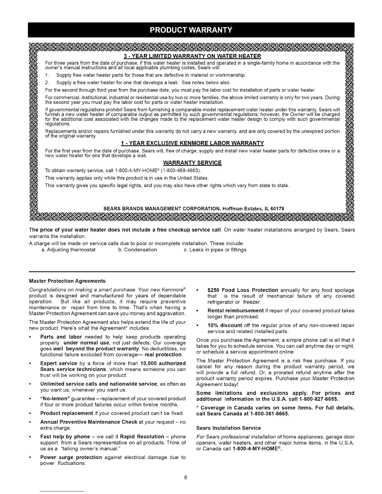 owner's manual instructions and all local applicable plumbing codes, Sears will: