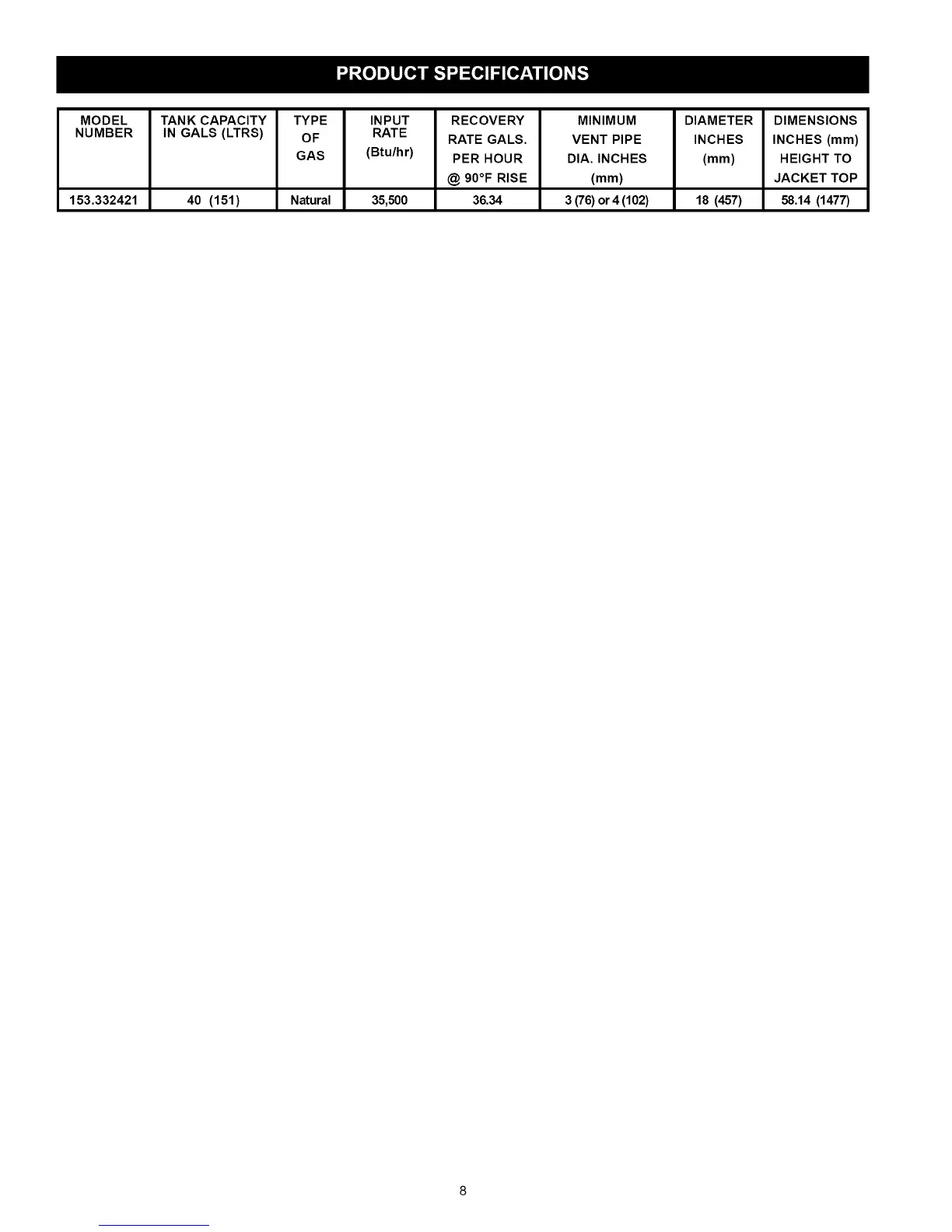 MODEL TANK CAPACITY TYPE INPUT RECOVERY MINIMUM DIAMETER DIMENSIONS