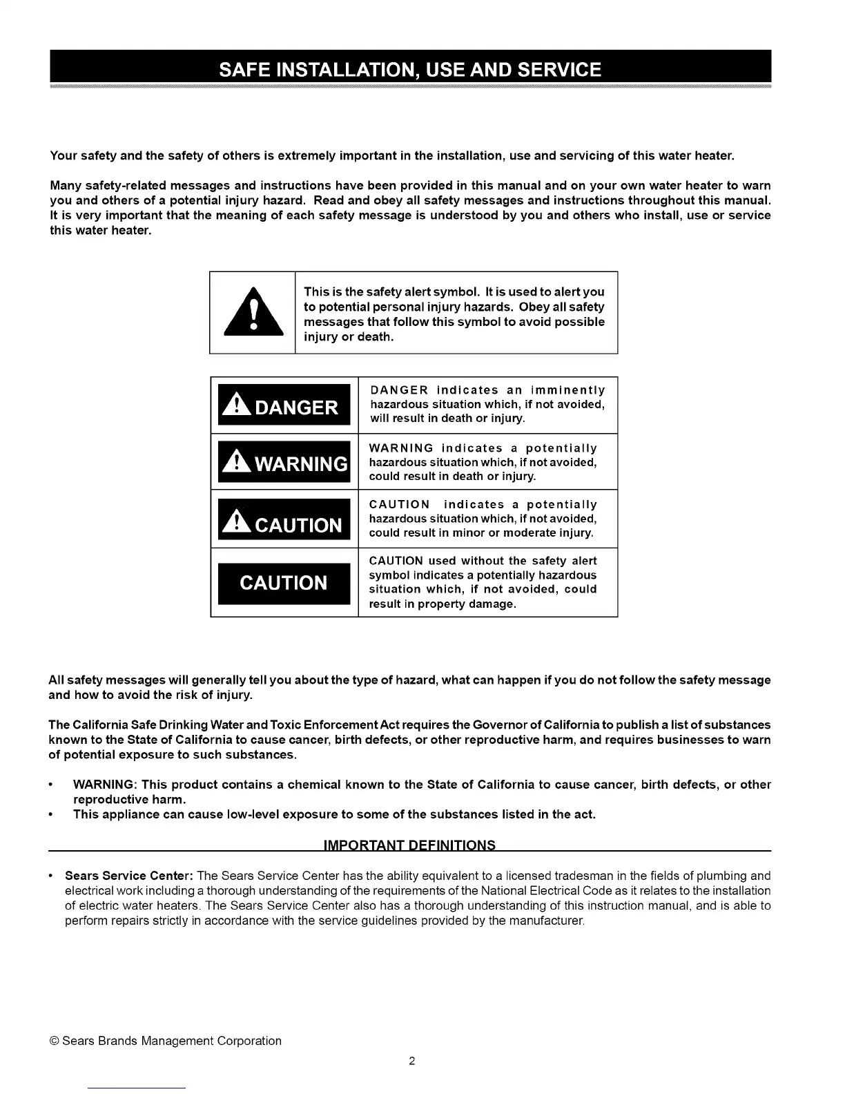 of electric water heaters. The Sears Service Center also has a thorough understanding of this instruction manual, and is able to