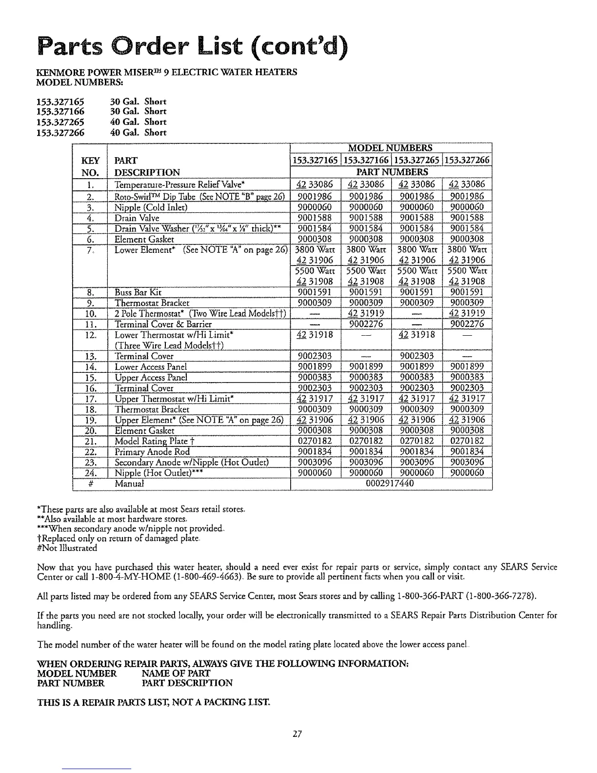 All parts listed may be ordered from any SEARS Service Center, most Searsstores and by calling 1-800-366-PART (I-800-366-7278).
