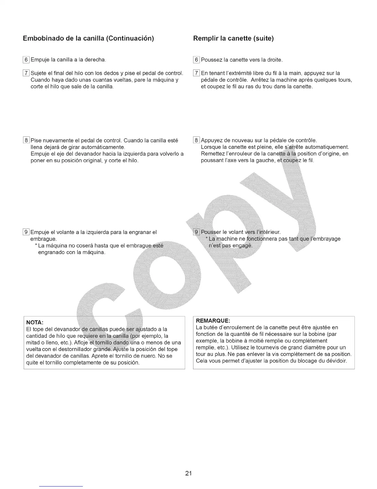 Embobinado de la canilla (Continuaci6n) Remplir la canette (suite)