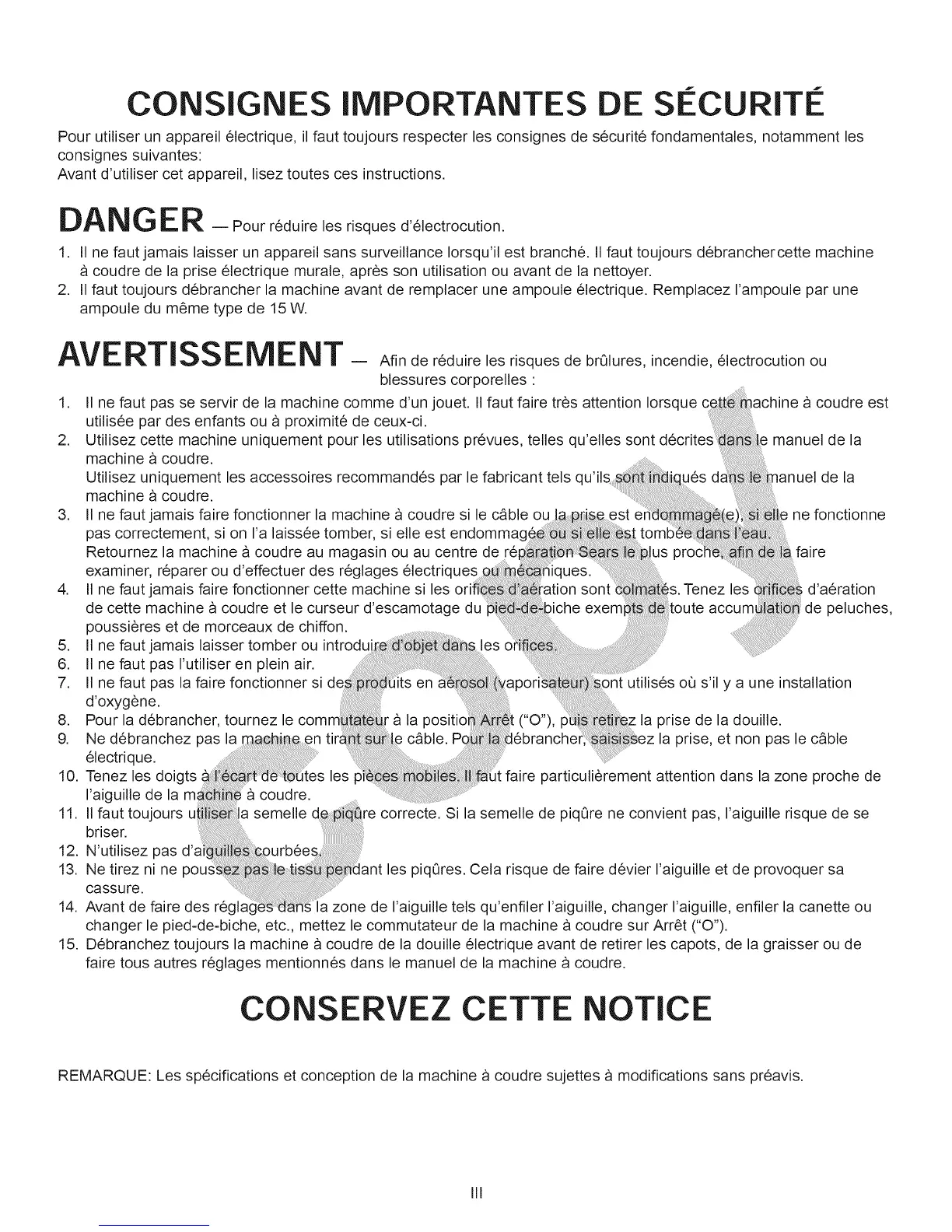 REMARQUE: Les sp6cifications et conception de la machine a coudre sujettes a modifications sans pr6avis.