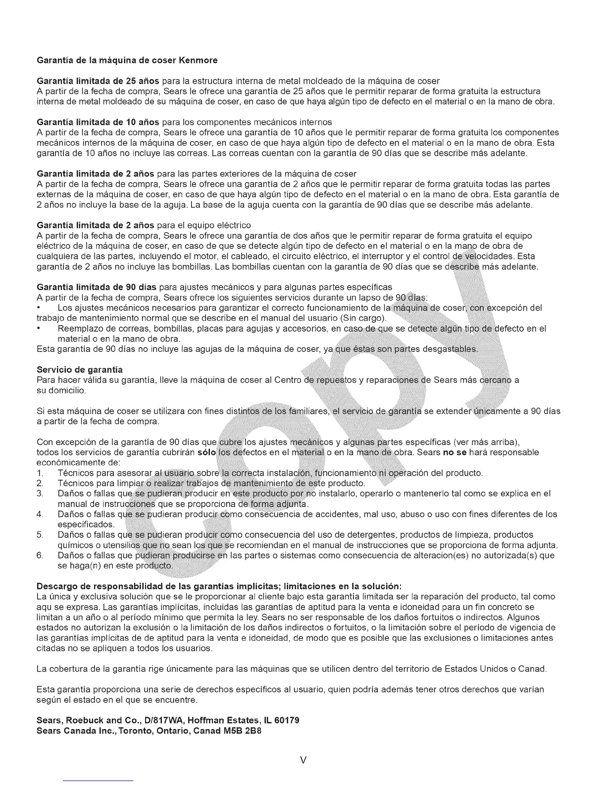 Garantia limitada de 25 aSos para la estructura intema de metal moldeado de la maquina de coser