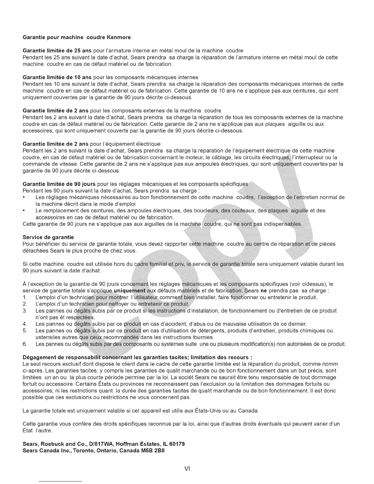 Pendant les 2 ans suivant la date d'achat, Sears prendra sa charge la reparation de t'equipement electrique de cette machine