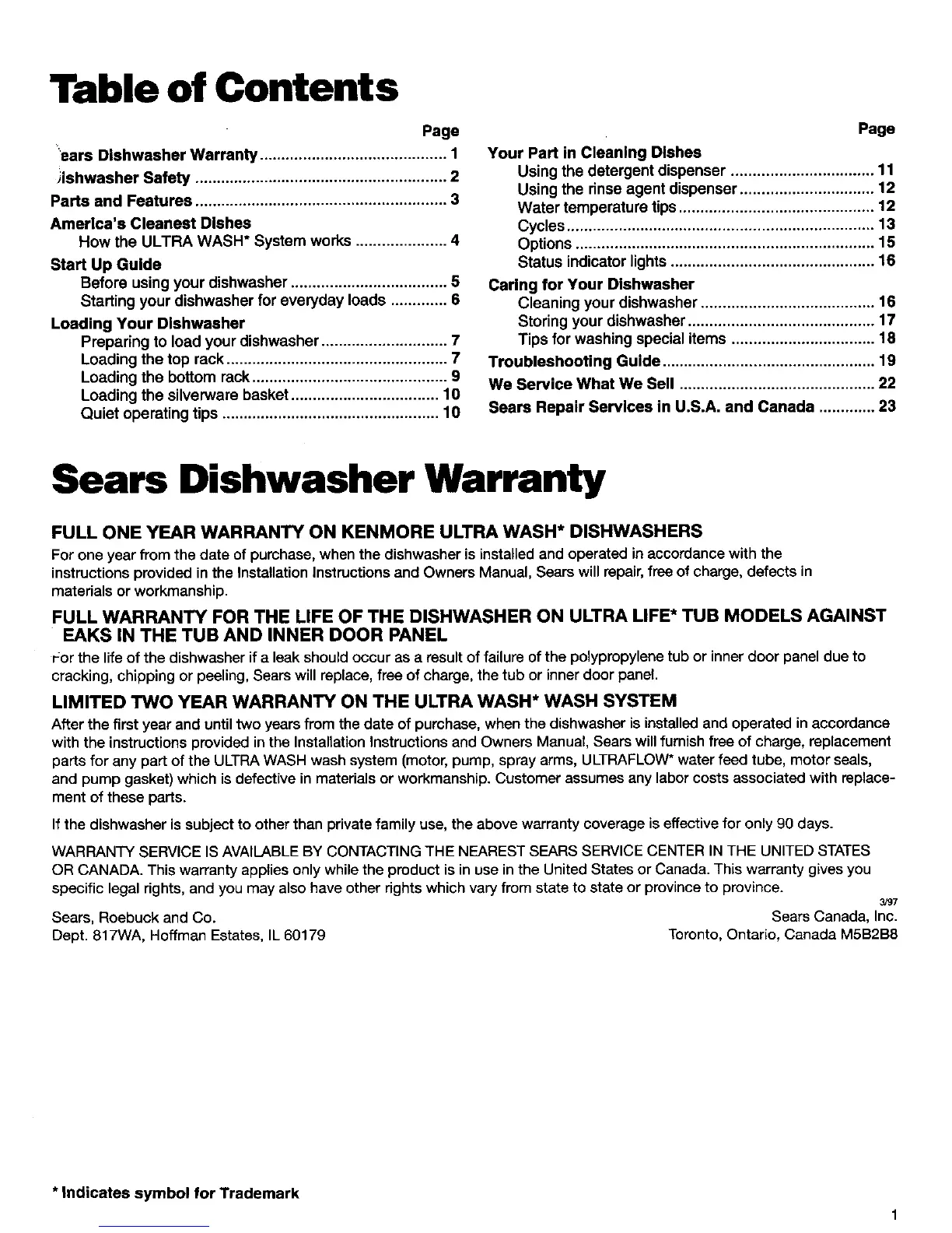 FULL ONE YEAR WARRANTY ON KENMORE ULTRA WASH* DISHWASHERS