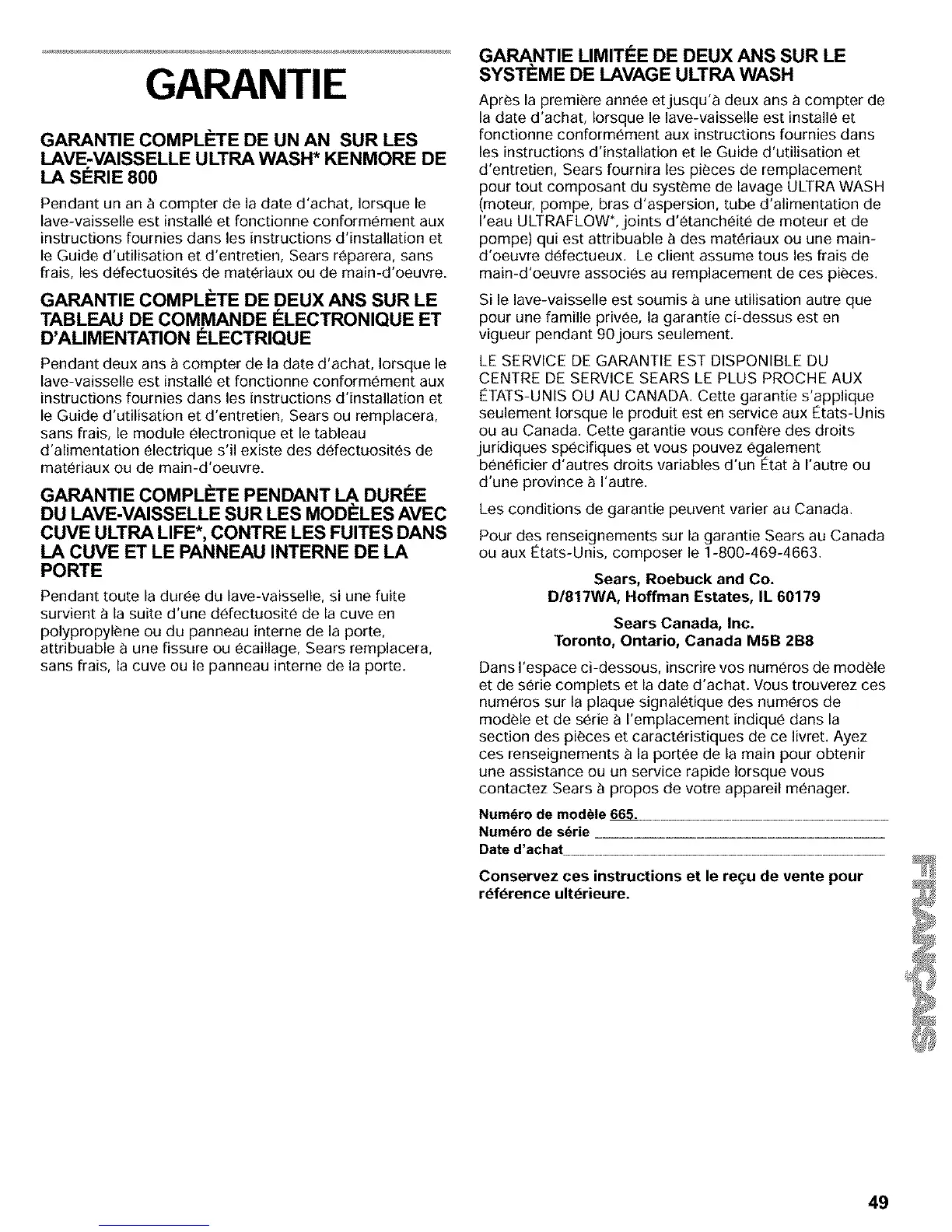 le Guide d'utilisation et d'entretien, Sears ou remplacera,