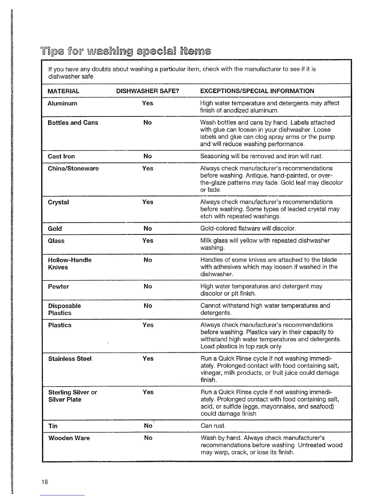 MATERIAL DISHWASHER SAFE? EXCEPTIONS/SPECIAL INFORMATION