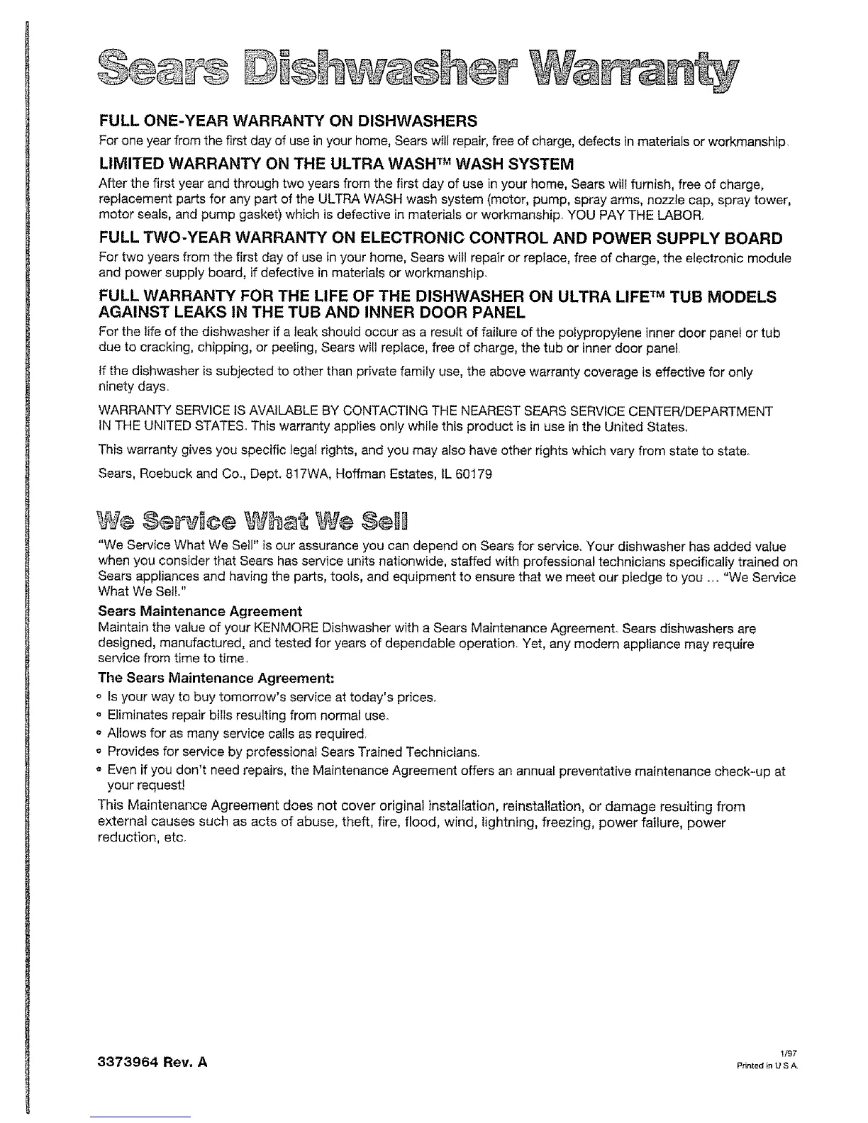 FULL WARRANTY FOR THE LIFE OF THE DISHWASHER ON ULTRA LIFE" rM TUB MODELS