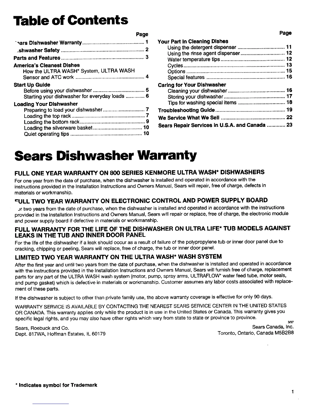 FULL ONE YEAR WARRANTY ON 800 SERIES KENMORE ULTRA WASH* DISHWASHERS