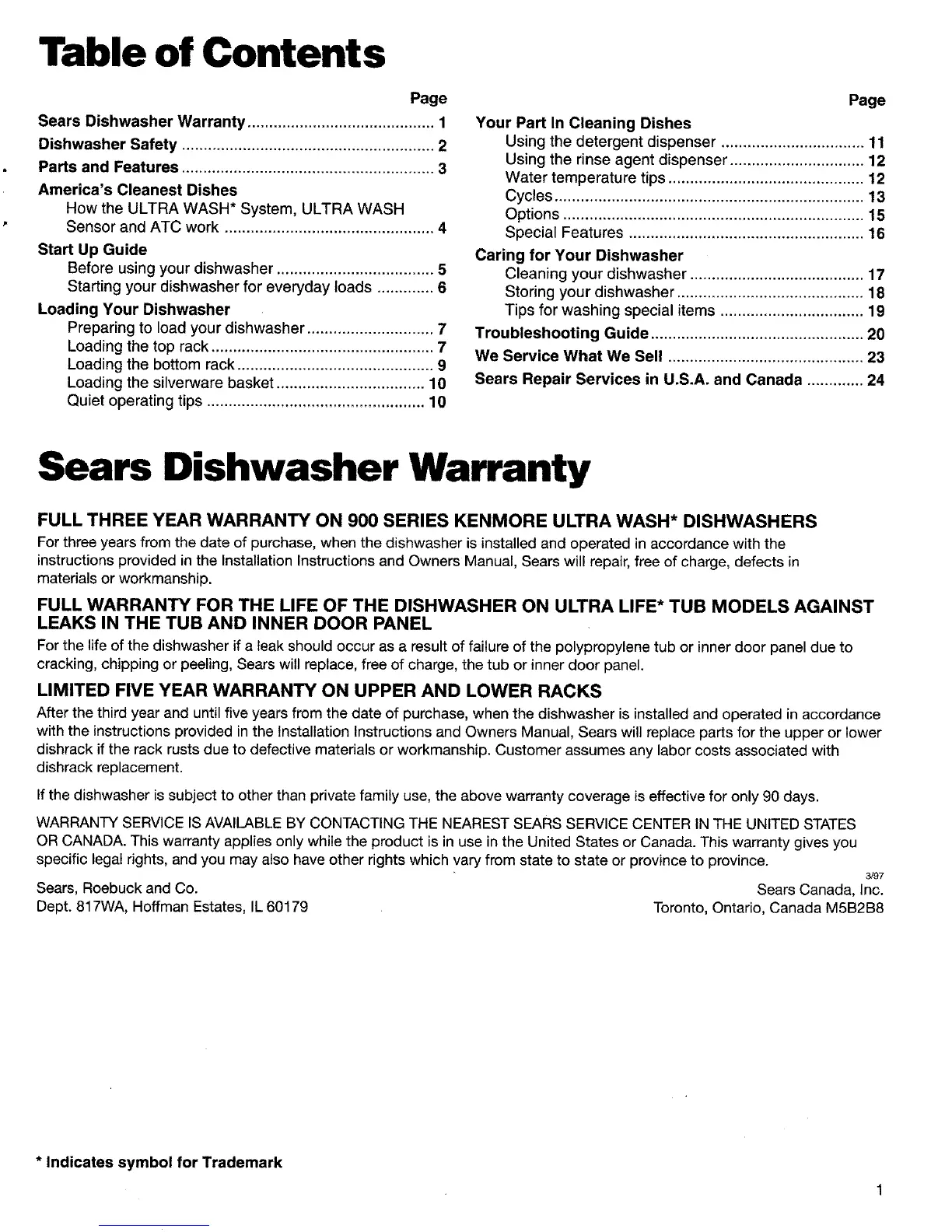 Sears Dishwasher Warranty ........................................... 1