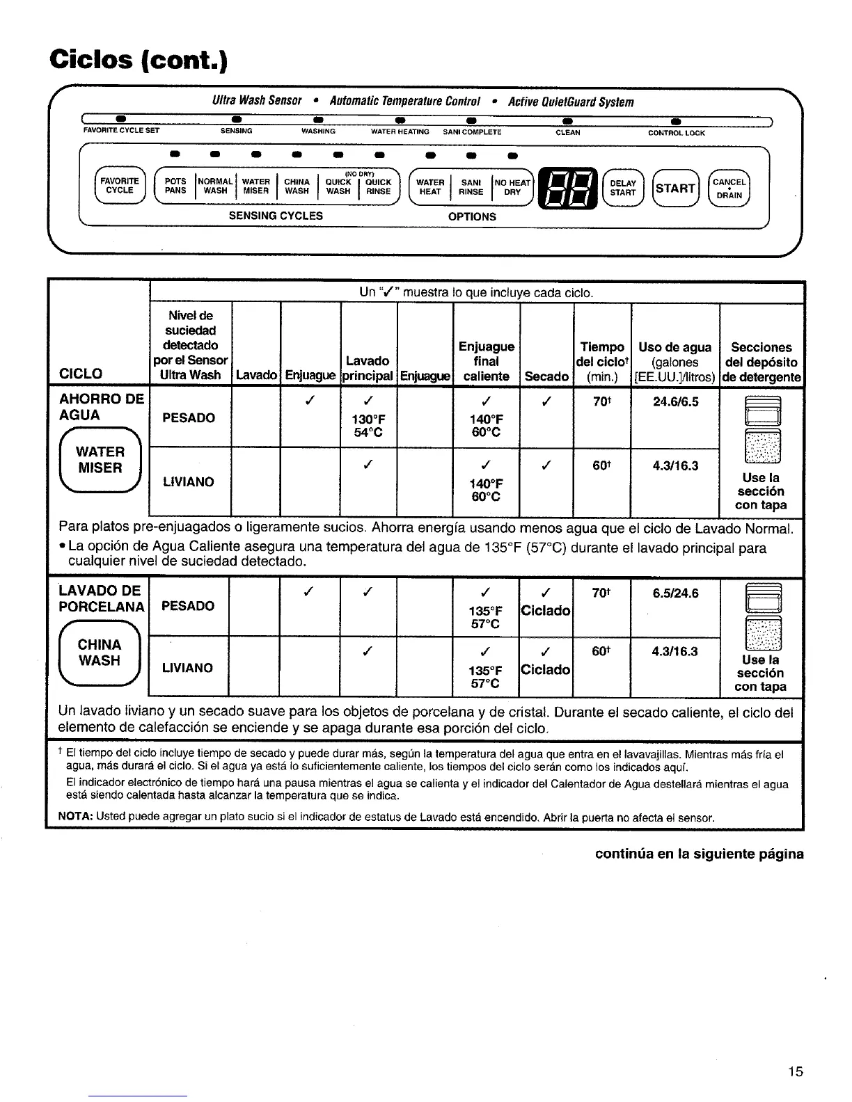 - La opci6n de Agua Caliente asegura una temperatura del agua de 135°F (57°C) durante el lavado principal para