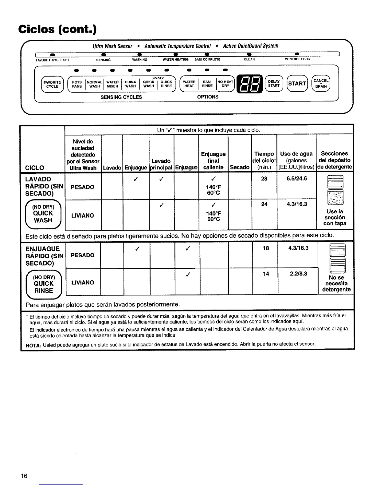 agua, m&s durara el ciclo. Si el agua ya est_ Io suficientemente caliente, los tiempos del ciclo seran como los indicados aquf.