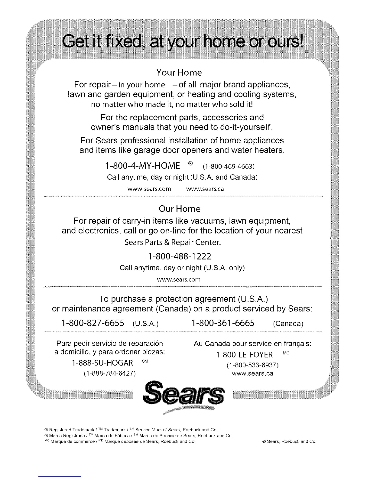 ® Registered Trademark / Trademark / SM Service Mark of Sears, Roebuck and Co.