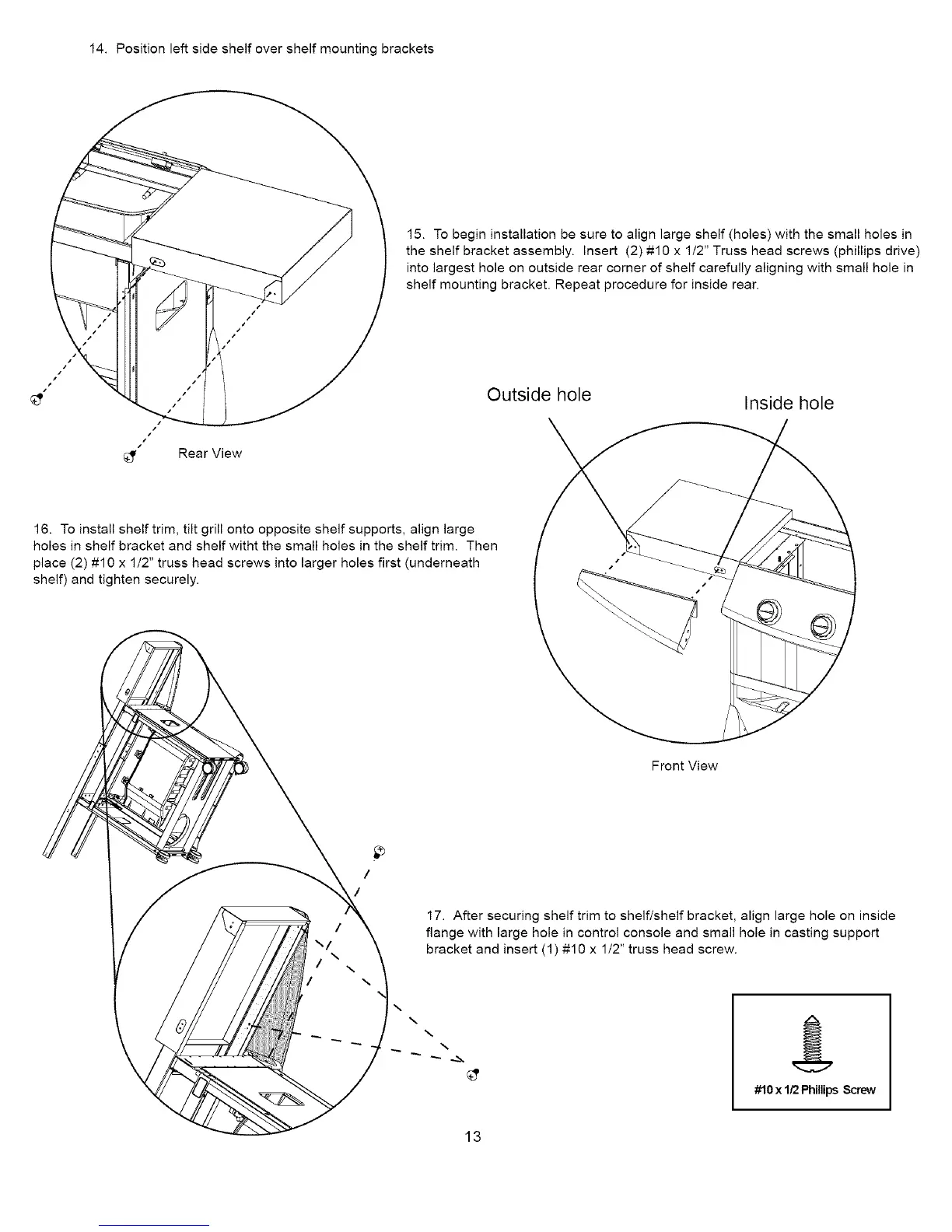 16. To install shelf trim, tilt grill onto opposite shelf supports, align large
