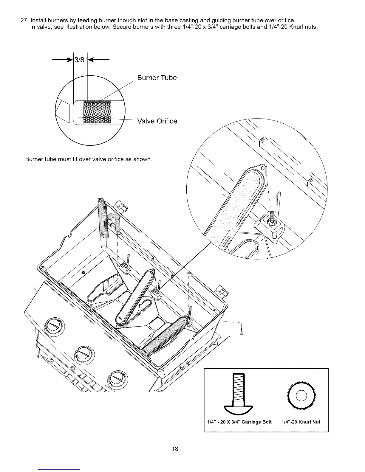 invalve,seeillustrationbelow.Secureburnerswiththree1/4"-20x3/4"carriageboltsand1/4"-20Knurlnuts.