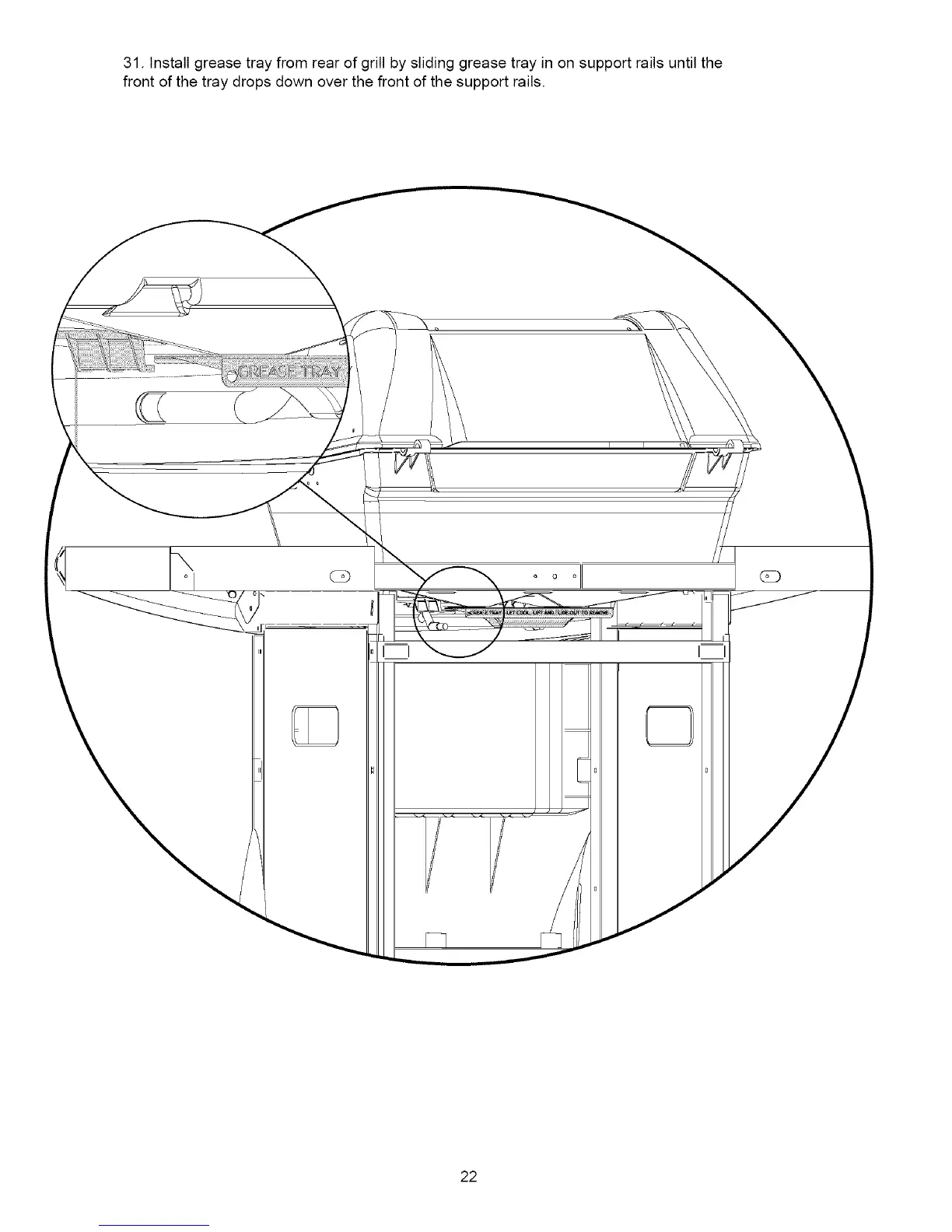 31.Installgreasetrayfromrearofgrillbyslidinggreasetrayinonsupportrailsuntilthe