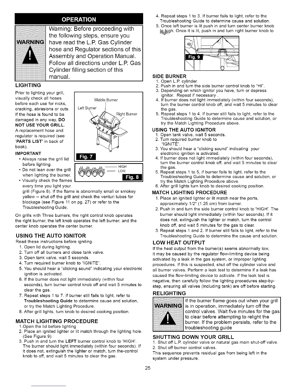 1. Shut off L.P. cylinder valve or natural gas main shut-off valve.