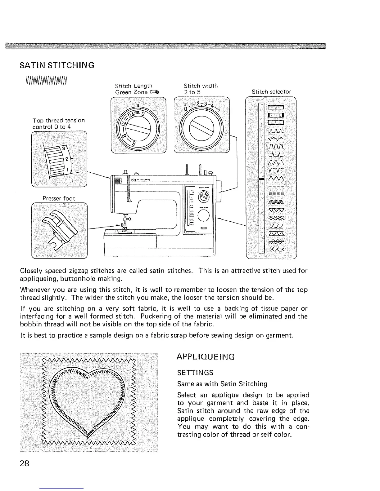 Closely spaced zigzag stitches are called satin stitches. This is an attractive stitch used for