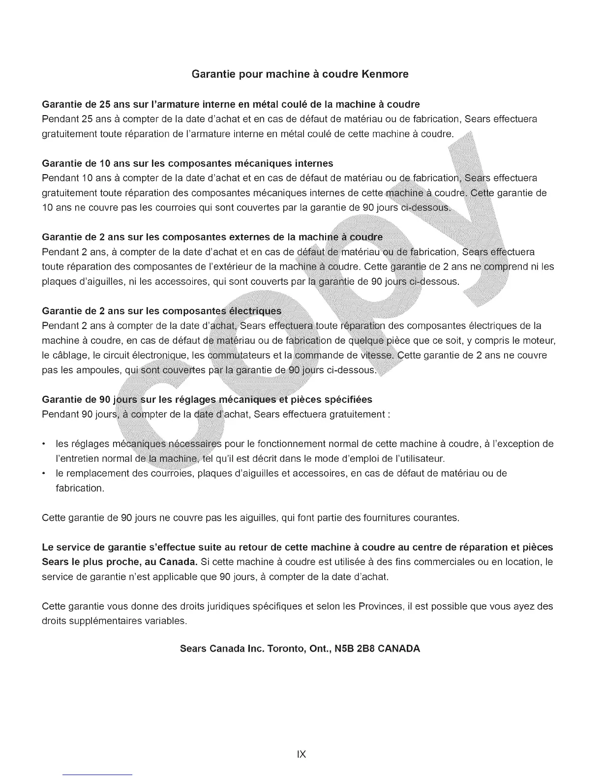 Sears le plus proche, au Canada. Si cette machine a coudre est utilis6e a des fins commerciales ou en location, le