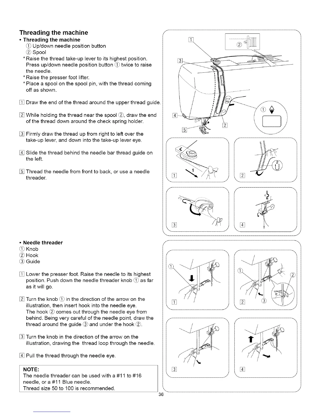 position. Push down the needle threader knob _ as far