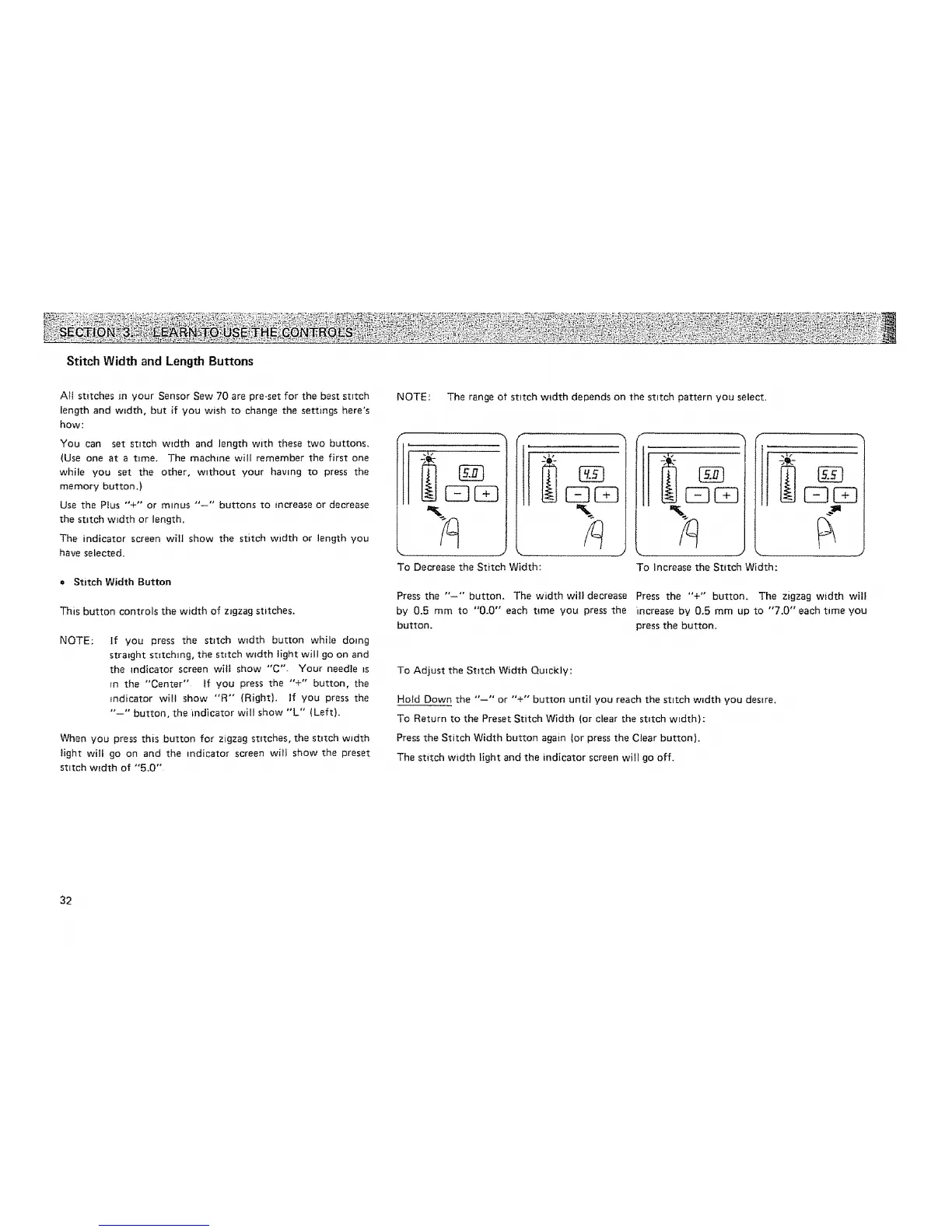 Hold Down the "'--°" or "+" button until you reach the stitch w_dth you desire.