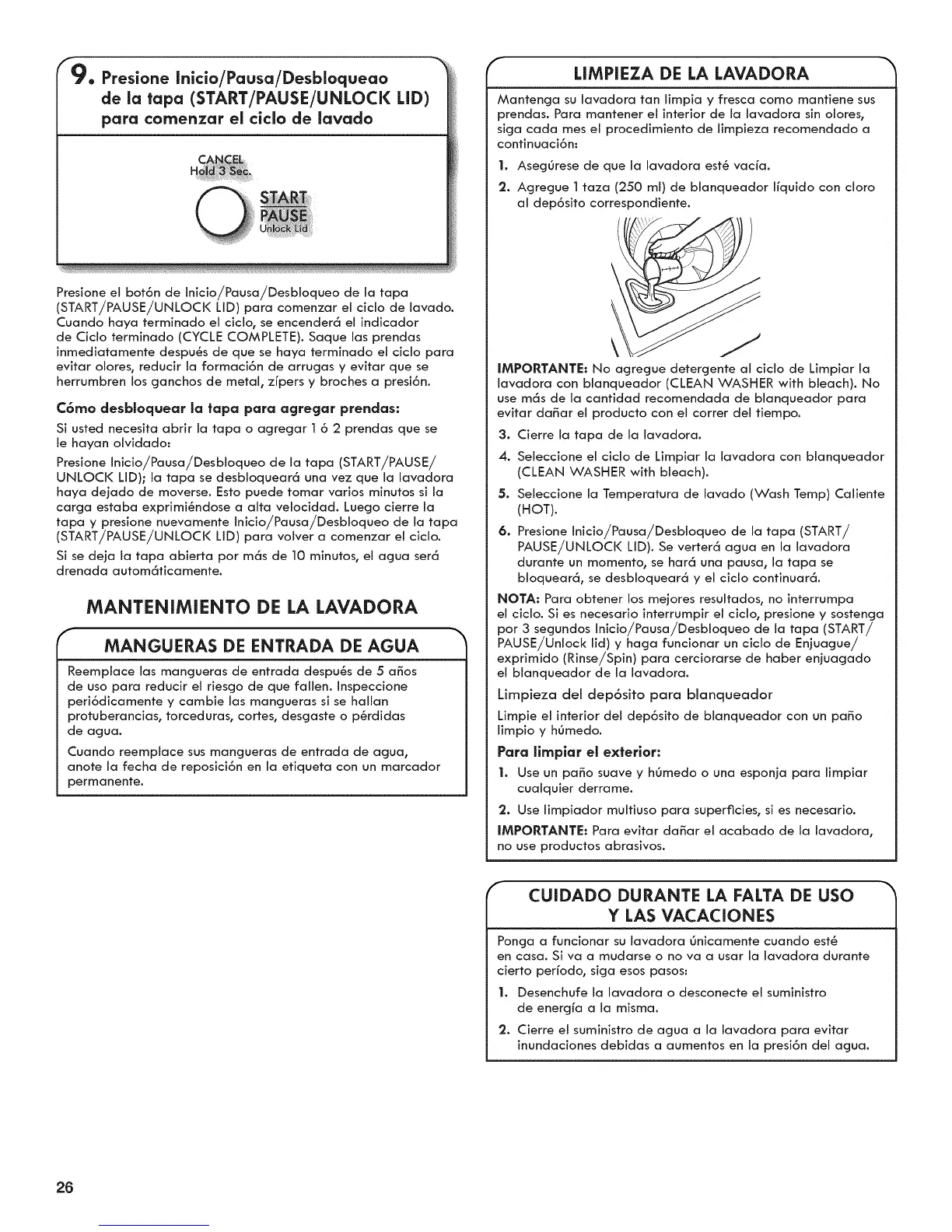 (START/PAUSE/UNLOCK LID) para comenzar el cicJo de lavado.