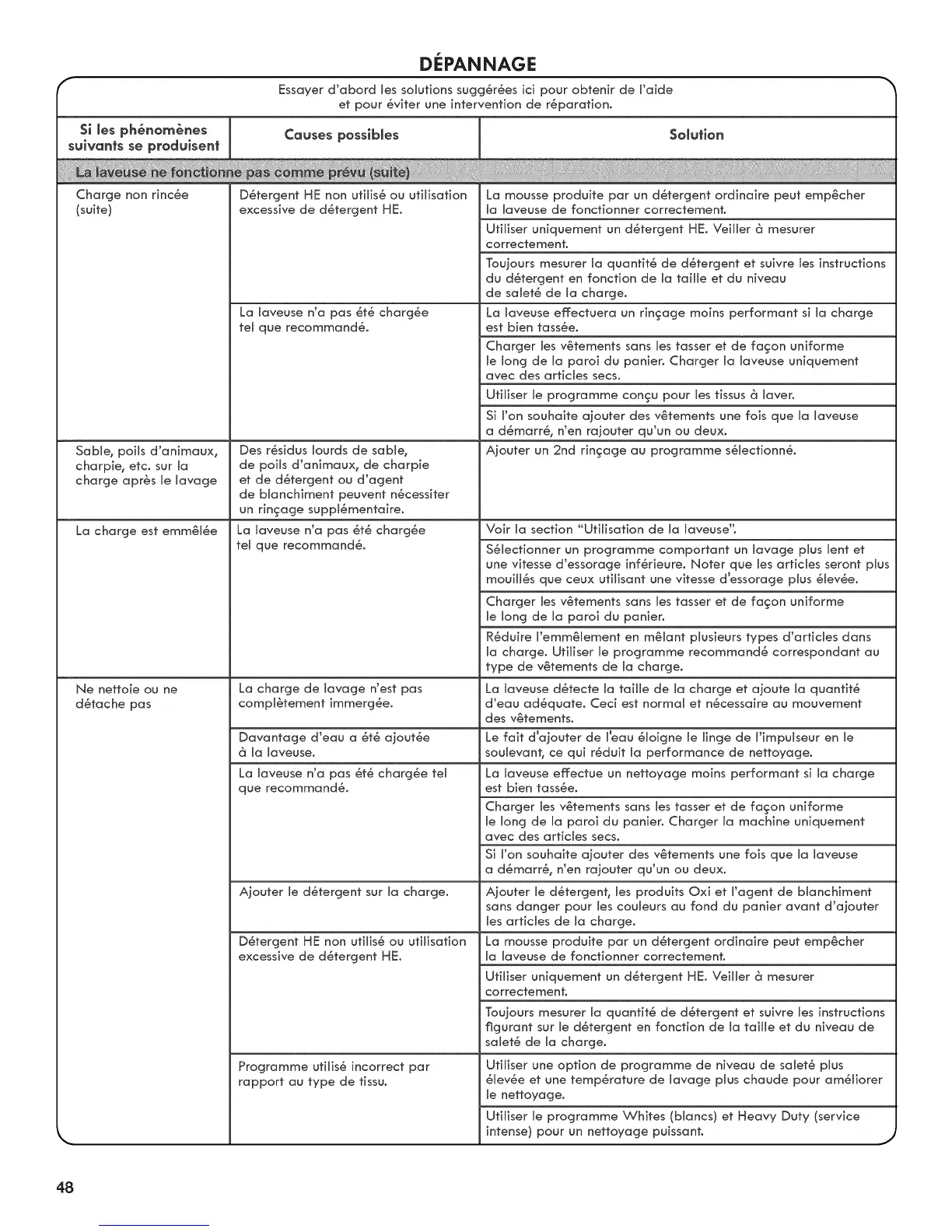 La laveuse effectue un nettoyage moins performant si la charge
