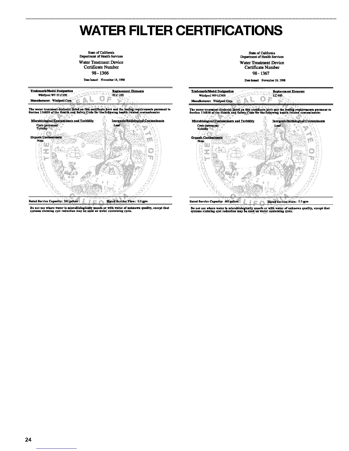 WATER FILTER CERTIFICATIONS