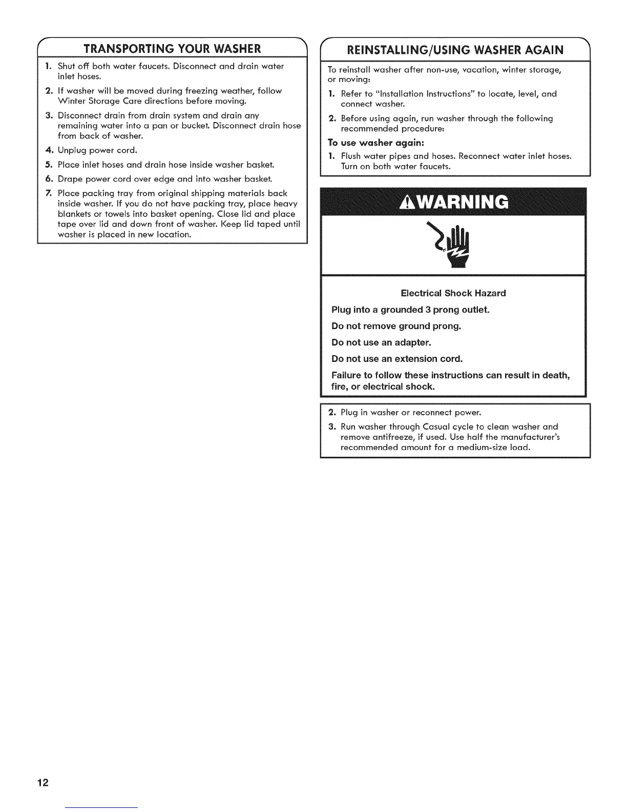 reinstall washer after non-use_vacation_ winter storage_