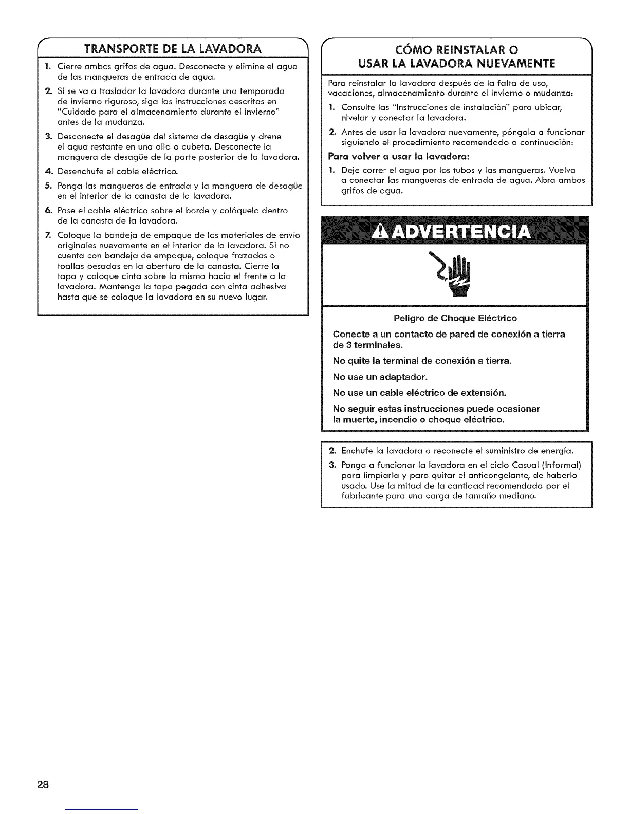 hasta que se co[oque la [avadora en su nuevo lugar.