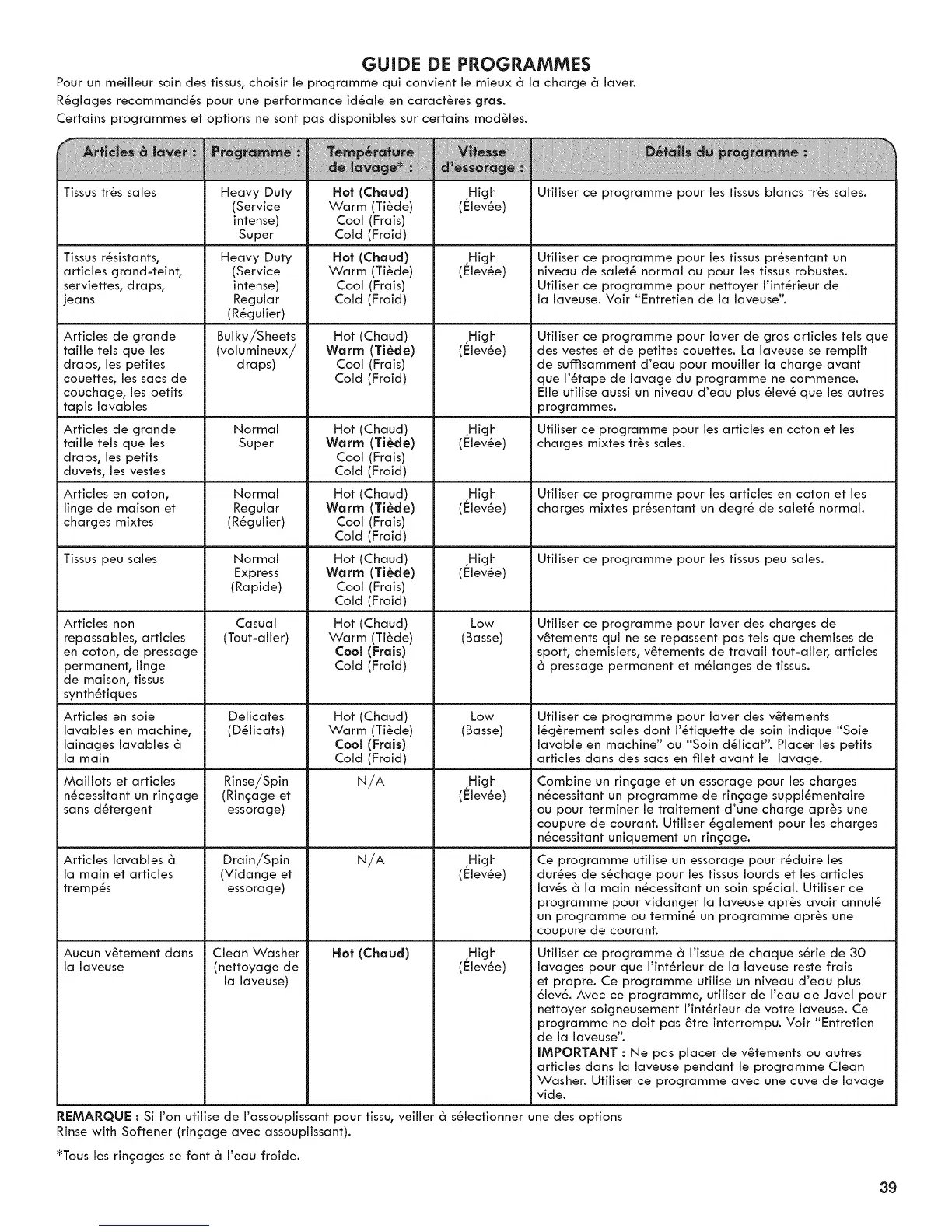 REMARQUE : Si I'on utilise de I'assouplissant pour tissu, veiller 6 s_lectionner une des options
