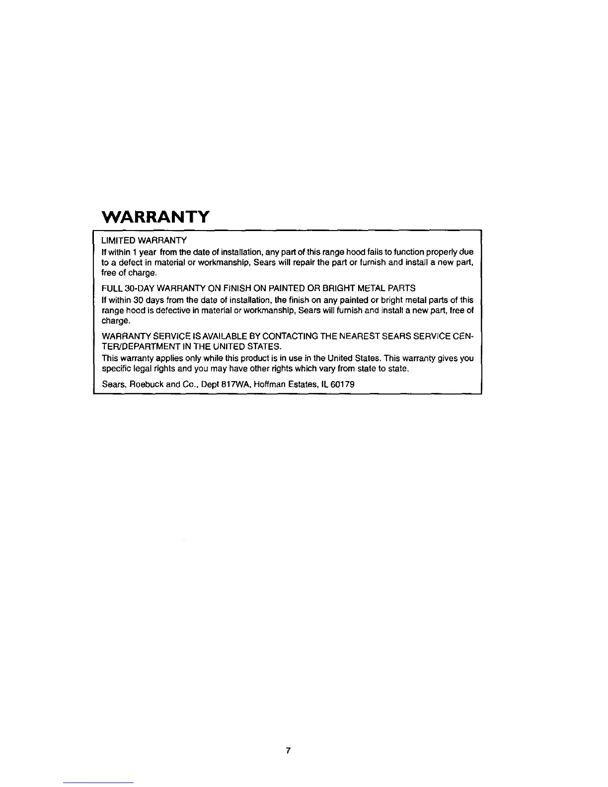 range hood is defective in material or workmanship, Sears will furnishand install a new part, free of