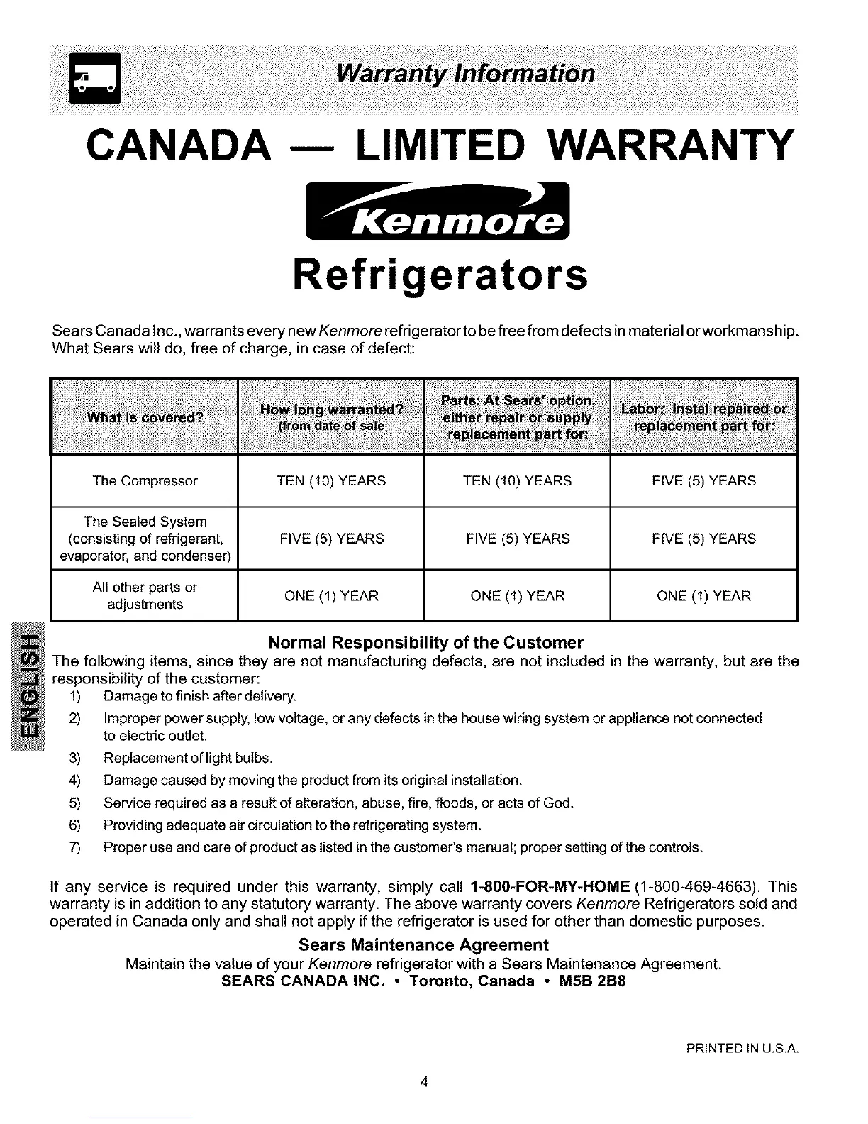 Sears Canada Inc., warrants every new Kenmore refrigerator to be free from defects in material or workmanship.