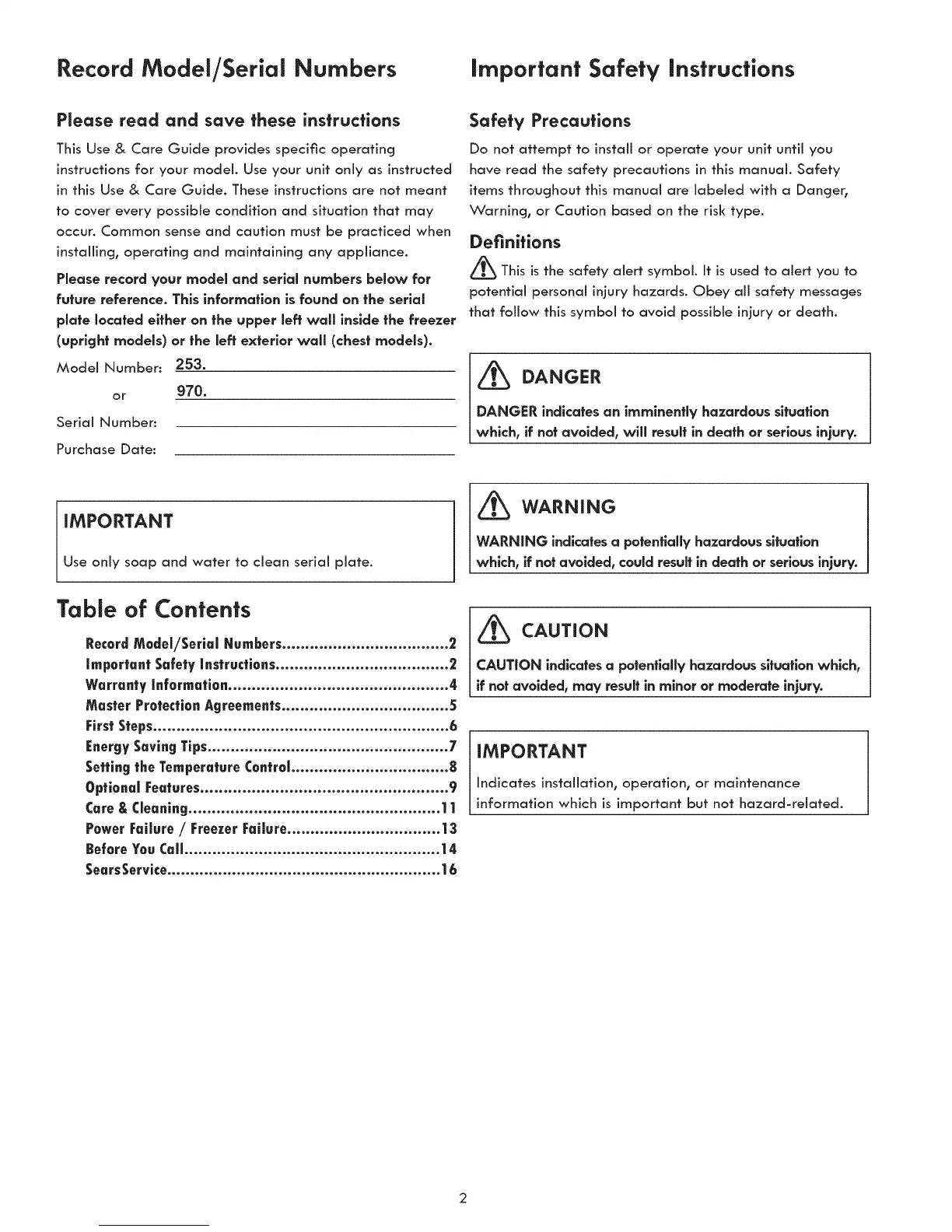 Record Model/Serial Numbers Important Safety Instructions