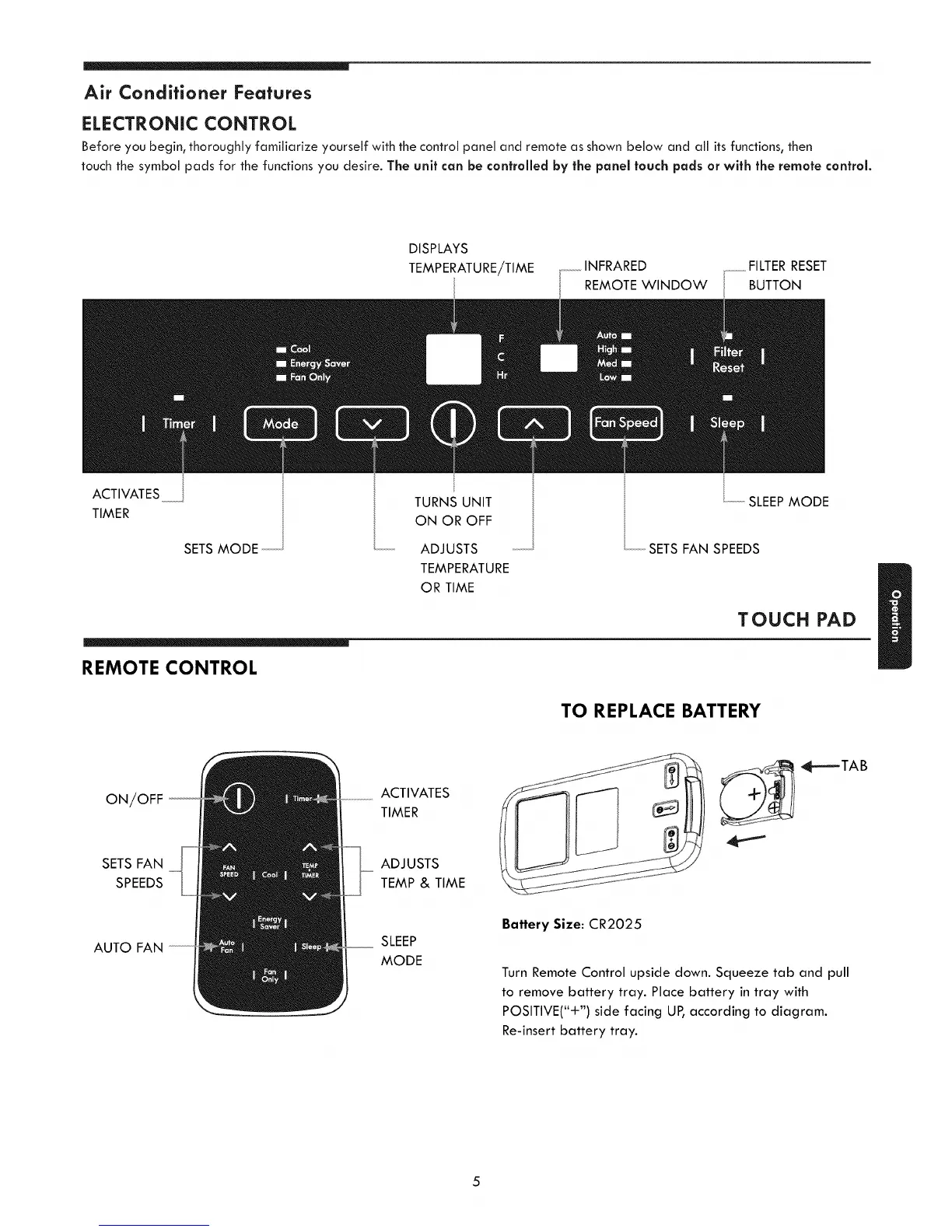 touch the symbol pads for the functions you desire. The unit can be controlled by the panel touch pads or with the remote control.
