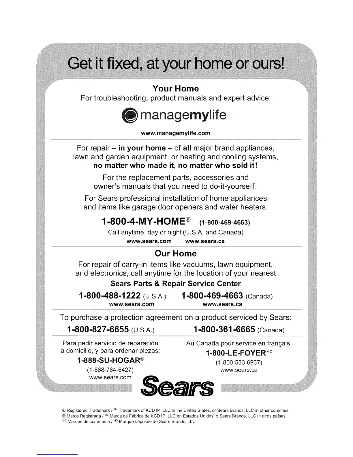 ® Registered Trademark / TMTrademark of KCD IP, LLC in the United States, or Sears Brands, LLC in other countries