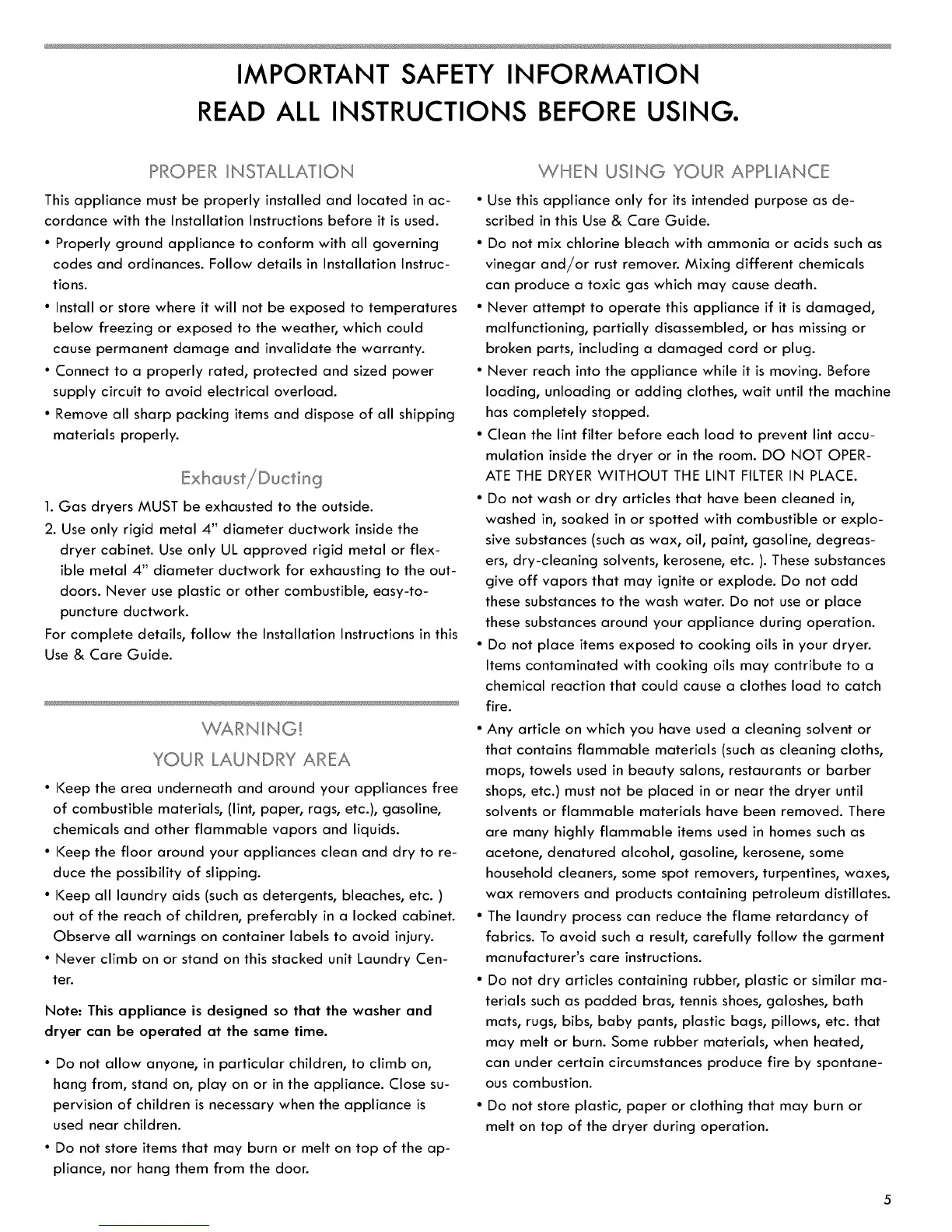 • Never climb on or stand on this stacked unit Laundry Cen-