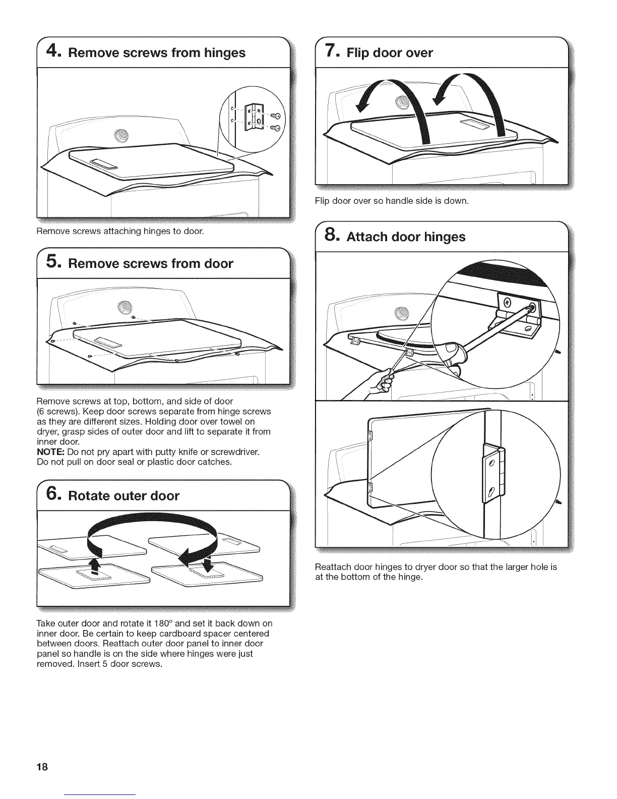 Reattach door hinges to dryer door so that the larger hole is