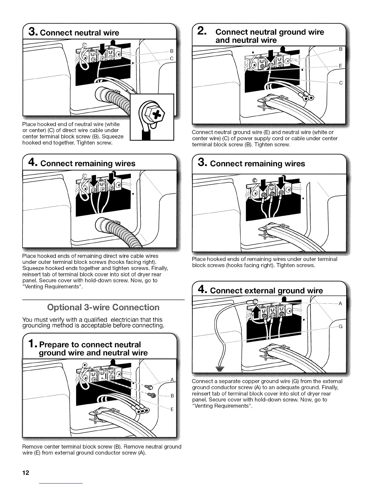 Connect neutral ground wire (E) and neutral wire (white or