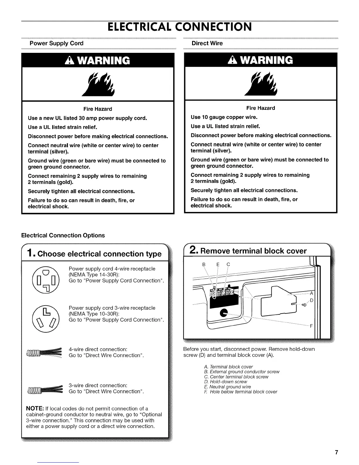 screw (D) and terminal block cover (A).