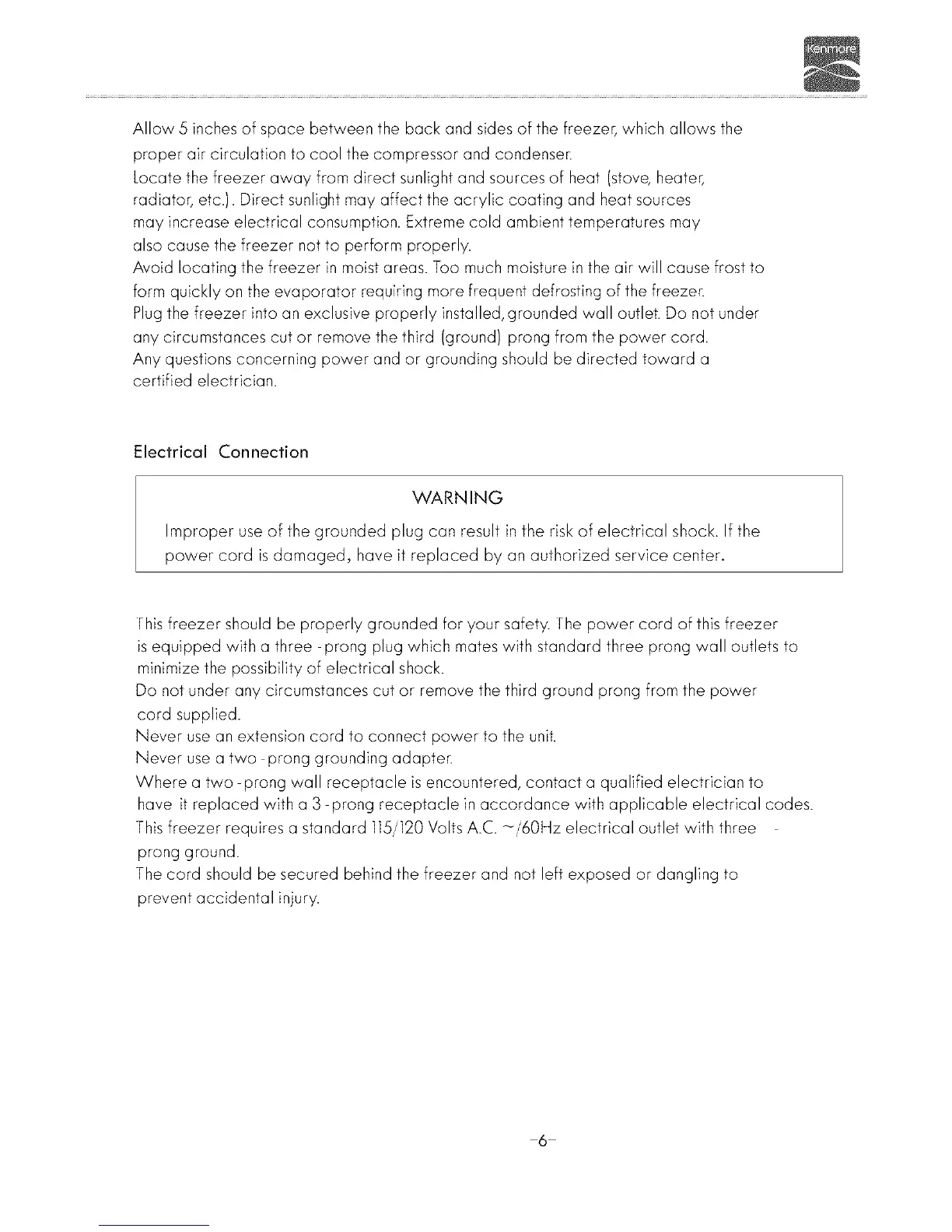 This freezer requires a standard 115/120 Volts A.C. -i60Hz electrical outlet with three