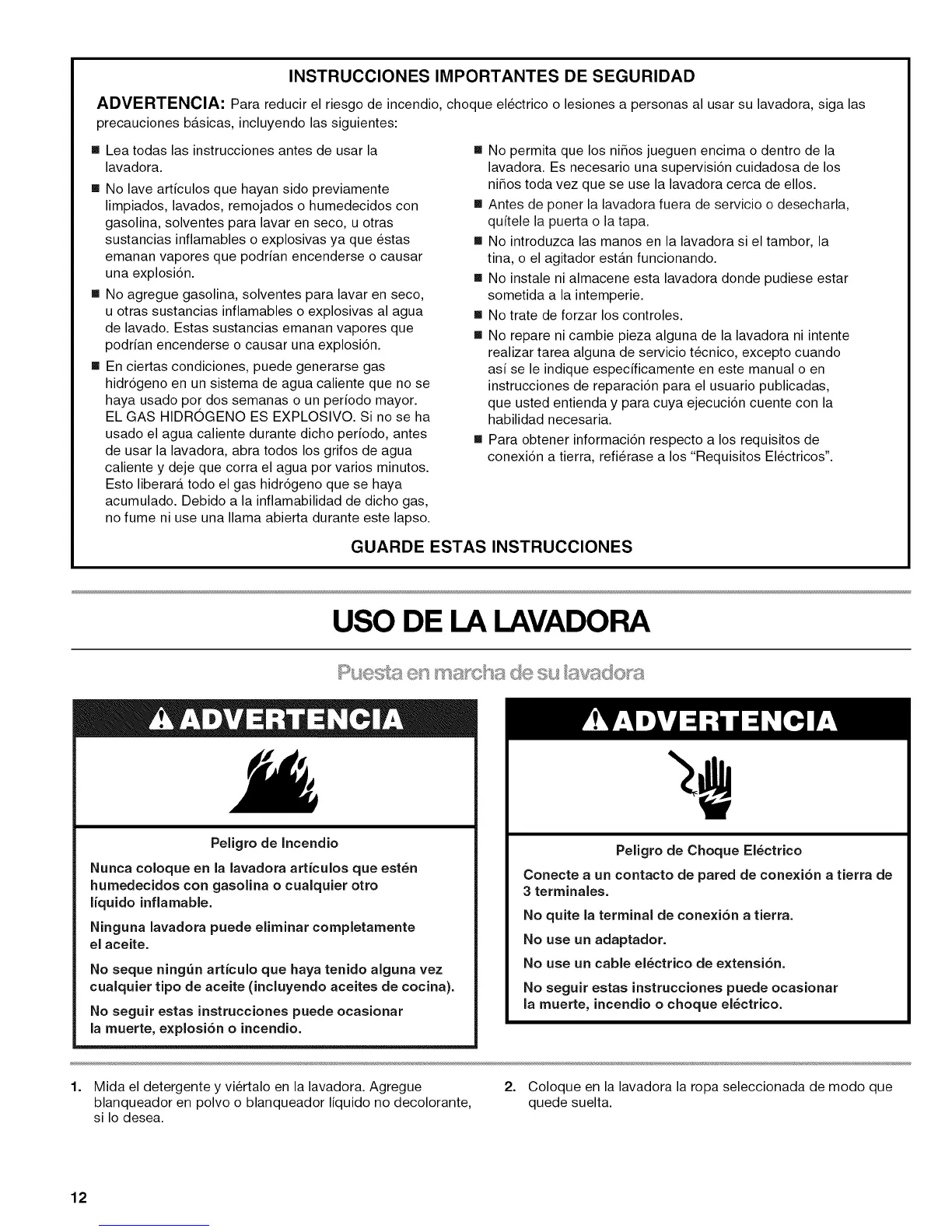 ADVERTENCIA: Para reducir el riesgo de incendio, choque electrico o lesiones a personas al usar su lavadora, siga las