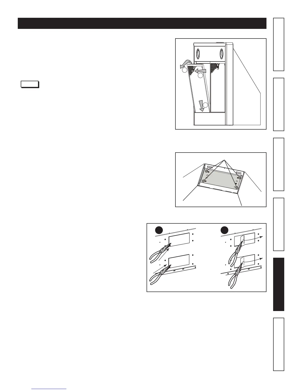 Remove grease fi lters by lifting the metal latch tab (1),