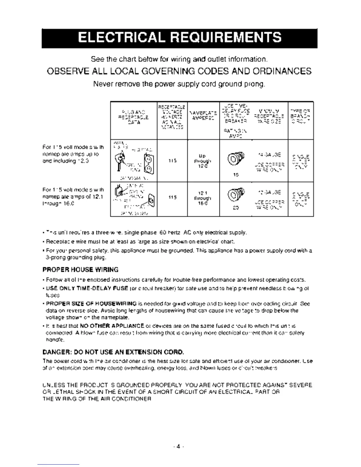 Kenmore 35050 - ELECTRICAL REQUIREMENTS; Proper House Wiring; Extension Cord Dangers