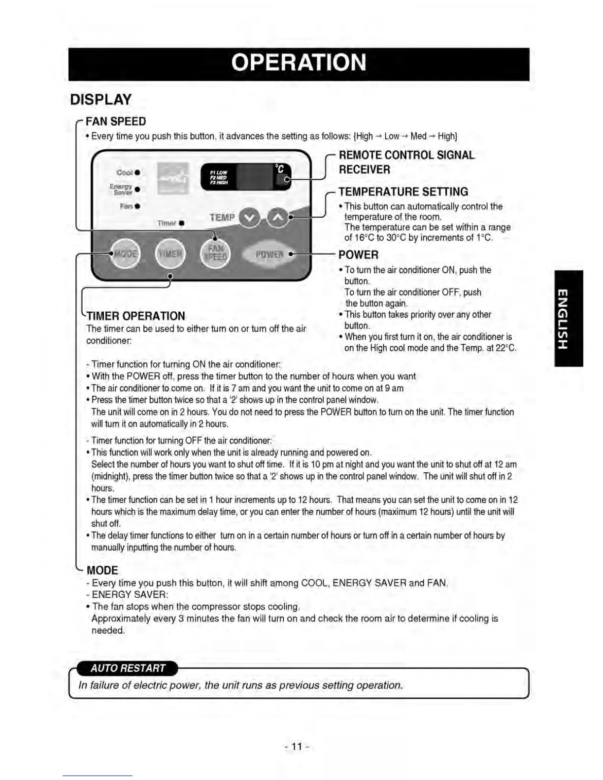 Kenmore 35924 - UNIT OPERATION; DISPLAY INDICATORS; TIMER OPERATION GUIDE; OPERATING MODES