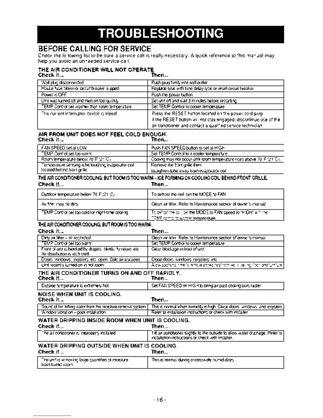 Kenmore 35924 - TROUBLESHOOTING GUIDE; BEFORE CALLING FOR SERVICE; UNIT OPERATION PROBLEMS; COOLING PERFORMANCE ISSUES