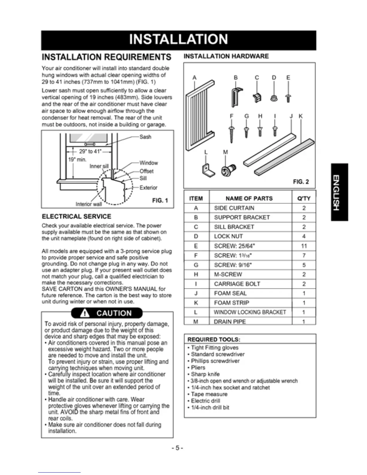 Kenmore 35924 - INSTALLATION GUIDE; INSTALLATION REQUIREMENTS; ELECTRICAL SERVICE CHECK; INSTALLATION HARDWARE LIST