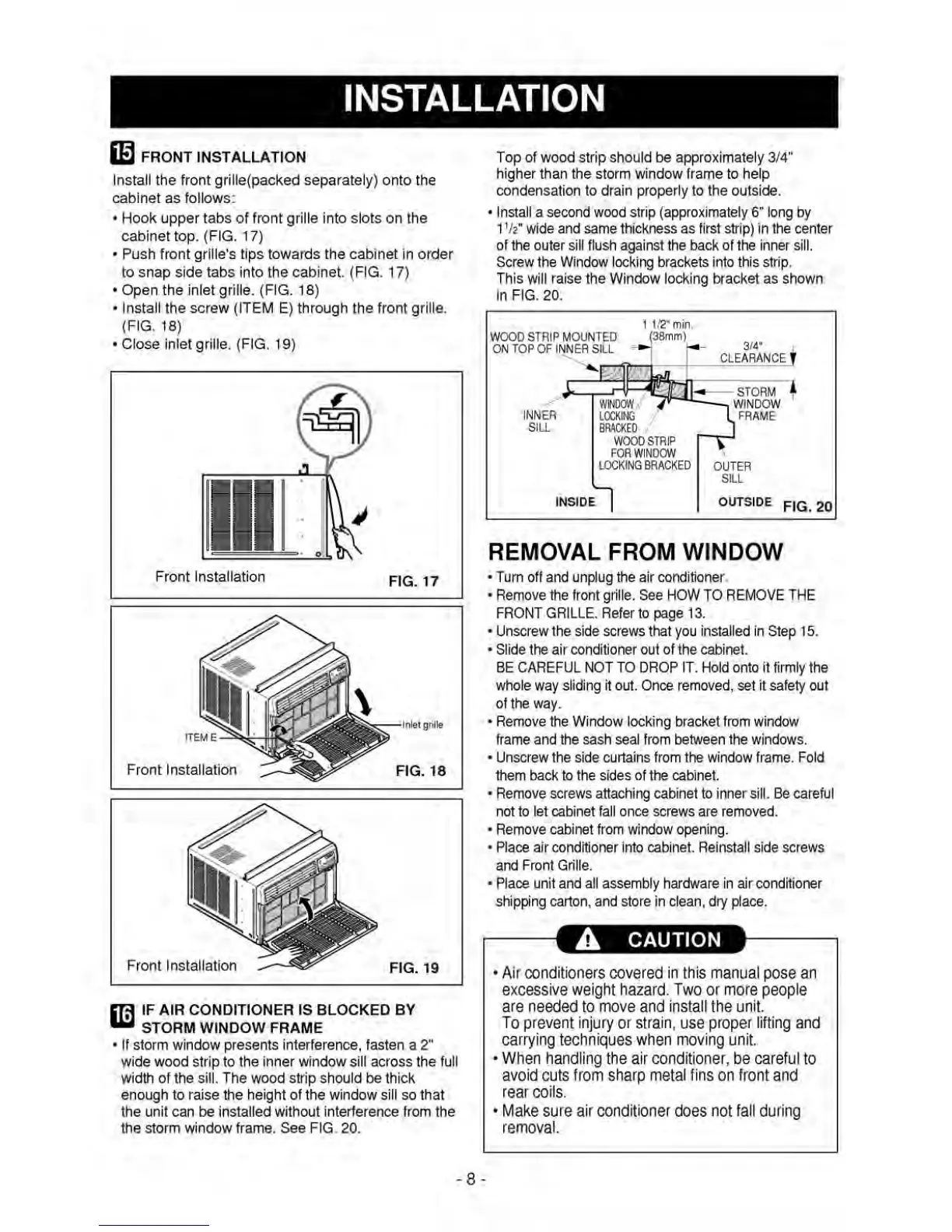Kenmore 35924 - INSTALLATION PROCEDURES; FRONT PANEL INSTALLATION; STORM WINDOW INSTALLATION INTERFERENCE; UNIT REMOVAL FROM WINDOW
