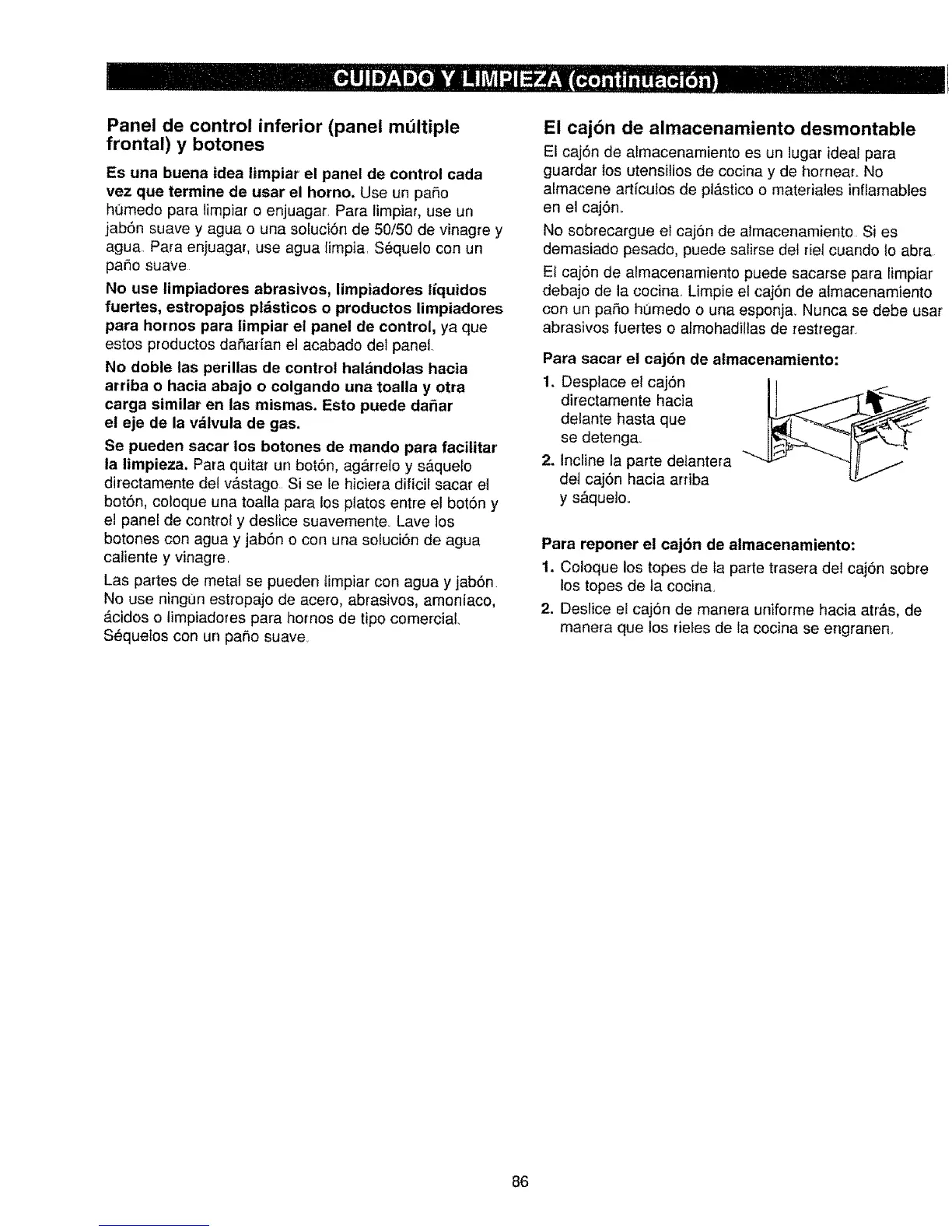 debajo de la cocina. Limpie et caj6n de almacenamiento