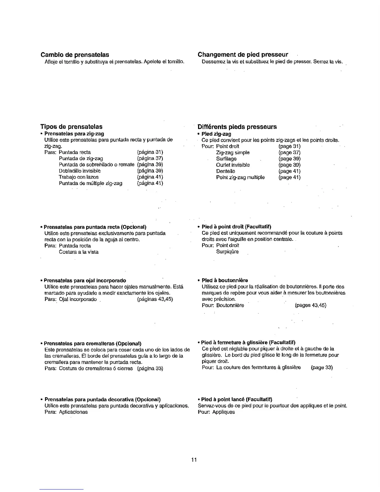 • Prensatelas pare cremalleras (Opcional)